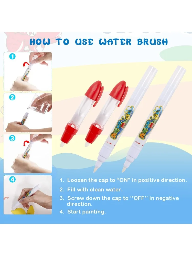 • Magic with Water: Just fill the included pens with water and draw—colors magically appear and then fade as the mat dries, ready to be reused again and again.