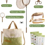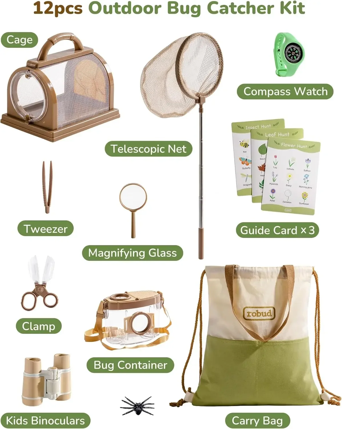All-in-One Adventure Kit: Includes a magnifying glass, telescopic net, tweezers, clamp, insect cage, specimen container, guide cards, and a durable carry bag.